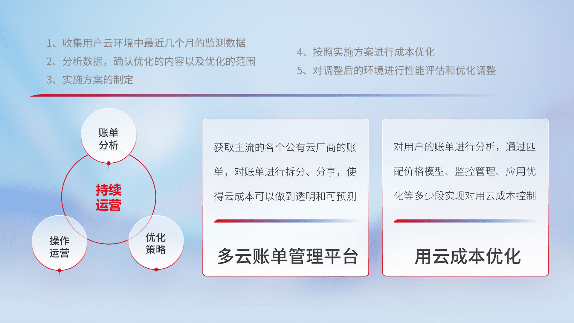 通过多云纳管,,,以统一的资源数据模型把客户的云资源进行抽象和封装,,,,进而实现对多云资源的统一操作,,,保障云资源管理的可靠性、、稳定性与可用性。。。。量身定制化运维内容,,配置、、开发运维、、、补丁管理、、备份、、、、监控、、认证和访问管理、、、、审计和日常巡检等,,,保障在用云过程中的可靠度,,,稳定度以及高可用率。。。。